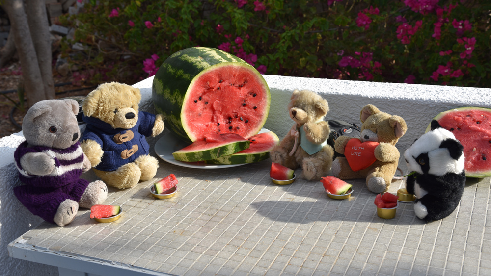 One day one of our humans bought a monster sized water melon. Wow! We got our share and enjoyed eating chuncks of it.