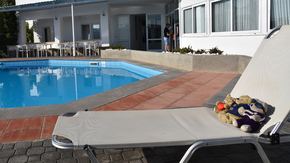 The sun was blaring down as we enjoyed the sunbeds at the swimming pool. Roger had to wear sun glasses. As a polar bear his eyes are a bit sensitive to the light.