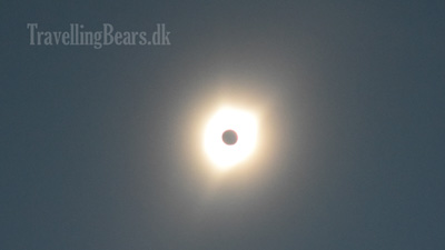 Slowly the light from the Sun started to dim. This was the transition, when the Moon covered only a part of the Sun and still it was all bright. But then, at 11.20 as predicted, everything darkened! Wow. People around were cheering. The bears were excited while recording the event.
